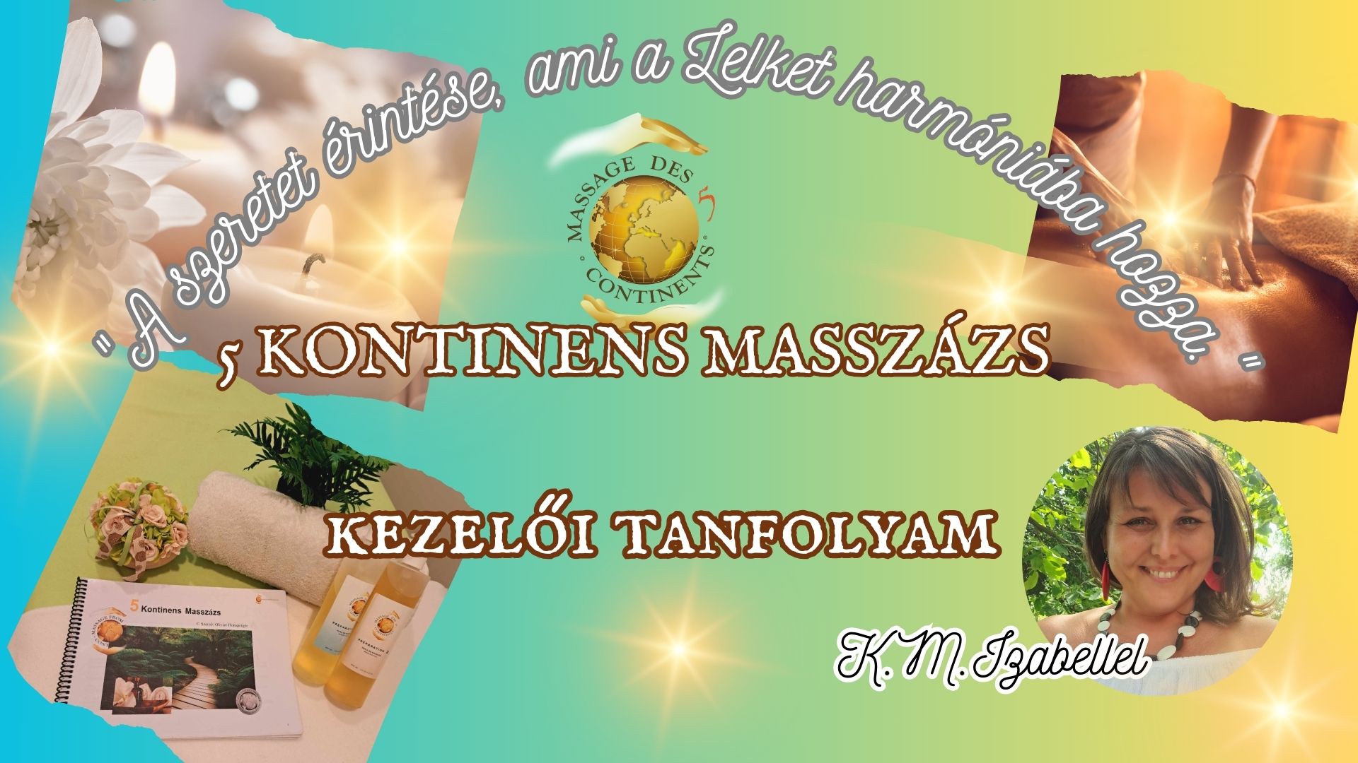 Szeretnéd elvégezni az 5 KONTINENS MASSZÁZS kezelői tanfolyamot nálam? Várlak szeretettel! Kérlek jelezd felém és megbeszéljük a következő időpontokat, lehetőségeket! Amennyiben saját városodban, vagy külföldön szeretnél tanfolyamot, van rá mód, egyeztessünk!